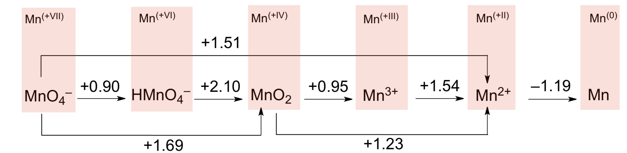 Und wir sehen das Stoffe, welche über einer Verbindungslinie zweier anderer Stoffe sind zur Disproportionierung neigen und umgekehrt. (zB $\ce{Mn^{3+} -> MnO2 + Mn^{2+}}$)
