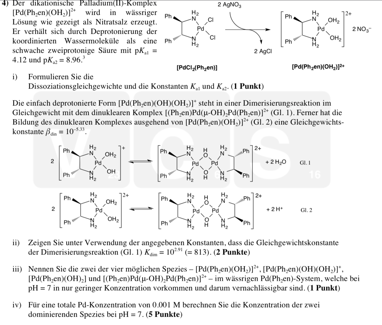 $\newcommand{\dede}[2]{\frac{\partial #1}{\partial #2} } \newcommand{\dd}[2]{\frac{d #1}{d #2}} \newcommand{\divby}[1]{\frac{1}{#1} } \newcommand{\typing}[3][\Gamma]{#1 \vdash #2 : #3} \newcommand{\xyz}[0]{(x,y,z)} \newcommand{\xyzt}[0]{(x,y,z,t)} \newcommand{\hams}[0]{-\frac{\hbar^2}{2m}(\dede{^2}{x^2} + \dede{^2}{y^2} + \dede{^2}{z^2}) + V\xyz} \newcommand{\hamt}[0]{-\frac{\hbar^2}{2m}(\dede{^2}{x^2} + \dede{^2}{y^2} + \dede{^2}{z^2}) + V\xyzt} \newcommand{\ham}[0]{-\frac{\hbar^2}{2m}(\dede{^2}{x^2}) + V(x)} \newcommand{\konko}[2]{^{#1}\space_{#2}} \newcommand{\kokon}[2]{_{#1}\space^{#2}} $ # Lektion # Repe Metallzahlen Wichtige Anmerkung: - d-elektronen sind bei komplexen alle valenzelektronen (dh inklusive s) Welche Zahlen gibt es? - OZ - d-konfiguration - VEC Was bedeuten sie? - Anzahl abgegebener $e^{-1}$ - Anzahl Elektronen verfügbar für Bindungen - Anzahl Elektronen in Valenzschale Bestimmung: 1) OZ: Ladung + Anzahl X-Liganden (Liganden die “normal gebunden” sind) 2) d-konfiguration: Standard d-elektronen (einfach die Periode) - OZ 3) VEC: $2\cdot L + X + \textrm{Periode} - \textrm{Gesamtladung}$ Beispiel: $\ce{Rh(PPh3)3Cl}$ (Wilkinsons Catalyst) 1) OZ = 1 ($\ce{PPh3}$ existiert einfach so (analog zu $NH_{3}$) ) 2) d-konfiguration: 9 - 1 = 8 3) VEC: $2\cdot3 + 1 + 9 - 0 = 16$ Konfiguration: $d8 \implies$ Quadratisch Planar # Komplexbildung Vorgehen Analog zur pH Rechnung Wichtig hier: Vereinfachen!!! wir erhalten sonst Gleichungen vom Grad 5>> Beispiel: **i)** $\ce{K_{a1}= \frac{[H+][HA+]}{[H2A^{2+}]}}$, $K_{a2} =\ce{\frac{[H+][A]}{[HA+]}}$ ii) $K_{dim}=\ce{\frac{[D^{2+}]}{[HA+]^{2}}}$ Wir haben $\beta_{dim}= \ce{\frac{[D^{2+}][H+]^{2}}{[H2A^{2+}]^{2}}}$ $\frac{\beta_{dim}}{K_{a1}^{2}}= \ce{\frac{[D^{2+}][H+]^{2}}{[H2A^{2+}]^{2}}} \cdot \ce{\frac{[H2A^{2+}]^{2}}{[H+]^{2}[HA+]^{2}}} = \ce{\frac{[D^{2+}]}{[HA+]^{2}}}=K_{dim}$ iii) K>> bedeutet wir haben mehr Produkt als Edukt $K_{dim}>>1 \implies [D] >> [HA^{+}]^{2}$ da $pK_{a1} < 7 < pK_{a2}$ $\implies$ $HA > A, H_{2}A$ Daraus folgt das $A$ und $H_{2}A$ vernachlässigbar sind iv) $Pd_{tot}=2D + A + HA + H_{2}A \approx 2D + HA = 2K_{dim}HA^{2} + HA$ $\implies$ $[HA]^{2} + \frac{[HA]}{2K_{dim}} - \frac{Pd_{tot}}{2K_{dim}} = 0$ $\frac{-b \pm \sqrt{b^{2}- 4ac}}{2a}$ $\frac{1}{2}\left(\frac{-1}{2K_{dim}} \pm \sqrt{\frac{1}{4K_{dim}^{2}} + \frac{2[Pd]_{tot}}{K_{dim}}}\right)$ $K_{dim}= 813$ $[HA] = \frac{1}{2}(\frac{-1}{2\cdot 813} \pm \sqrt{\frac{1}{4\cdot 813^{2}} + \frac{2\cdot 0.001M}{813}} )$ $= \frac{1}{2}\left(\frac{-1}{1626} + 0.001684\right)= 5.34 \cdot 10^{-4}M$ # Umfrage https://forms.gle/feWBBC2HQzQzRUPEA